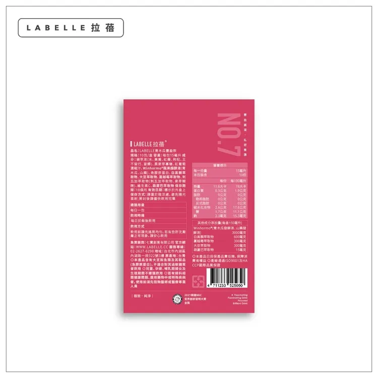 成分:植萃液(水、黃耆、紅棗、枸杞、王不留行、當歸)、異麥芽寡糖、紅葡萄濃縮汁、Winhormo™蔬果酸酵液(青木瓜、山藥)、魚膠原蛋白、白高顆萃取物大豆萃取物蔓越莓萃取物、刺五加萃取物(刺五加萃取物、麥芽糊精)、維生素C、葫蘆巴萃取物