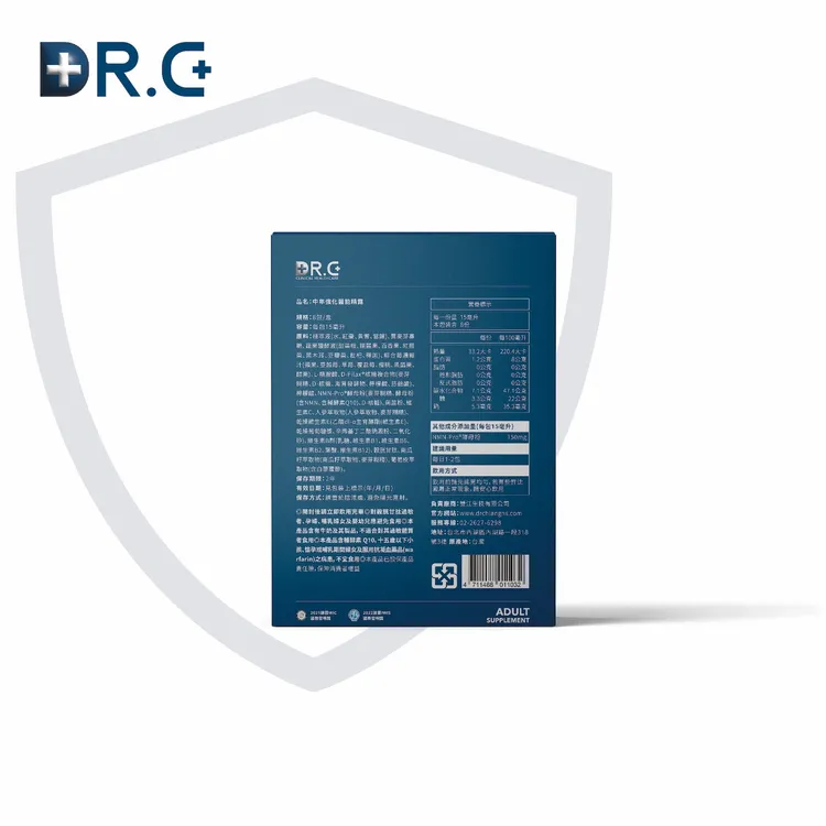 成分:植萃液(水、紅棗、黃耆、當歸)、異麥芽寡糖、蔬果醱酵液(甜菜根、諾麗果、百香果、紅鳳菜、黑 木耳、豆瓣菜、枇杷、釋迦)、綜合莓濃縮汁(蘋果、蔓越莓、草莓、覆盆莓、櫻桃、黑醋栗、醋栗)、 L-精胺酸、D-Filax®核糖複合物(麥芽糊精、D-核糖、海茸發酵物、檸檬酸、菸鹼酸)、檸檬酸、 NMN-Pro® 酵母粉(麥芽糊精、酵母粉(含菸醯胺單核苷酸(NMN)、輔酵素 Q10)、D-核糖)、蒟蒻粉、維生素 C、人參萃取物(人參萃取物、麥芽糊精)、乾燥維生素 E(乙酸 dl-α 生育醇酯(維生素 E)、乾燥葡萄糖漿、辛烯基丁二酸鈉澱粉、二氧化矽)、維生素B群(乳糖、維生素 B1、維生素 B6、 維生素 B2、葉酸、維生素 B12)、穀胱甘肽、南瓜籽萃取物(南瓜籽萃取物、麥芽糊精)、葡萄皮萃取物(含白藜蘆醇)