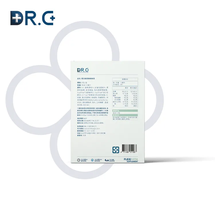 成分: 水、蘋果濃縮汁、紅葡萄濃縮汁、異麥芽寡糖、麥芽糊精、葡萄糖胺鹽酸鹽、ScalTide® 魚膠原蛋白、 HariTide® 訶子發酵液、D-Filax® 核糖複合物(麥芽糊精、D-核糖、海茸發酵物、檸檬酸、 菸鹼酸)、甲基硫醯基甲烷(Methylsulfonylmethane,MSM)、葡萄糖酸鋅、香料、玉米糖膠 、薑黃萃取物、維生素 C