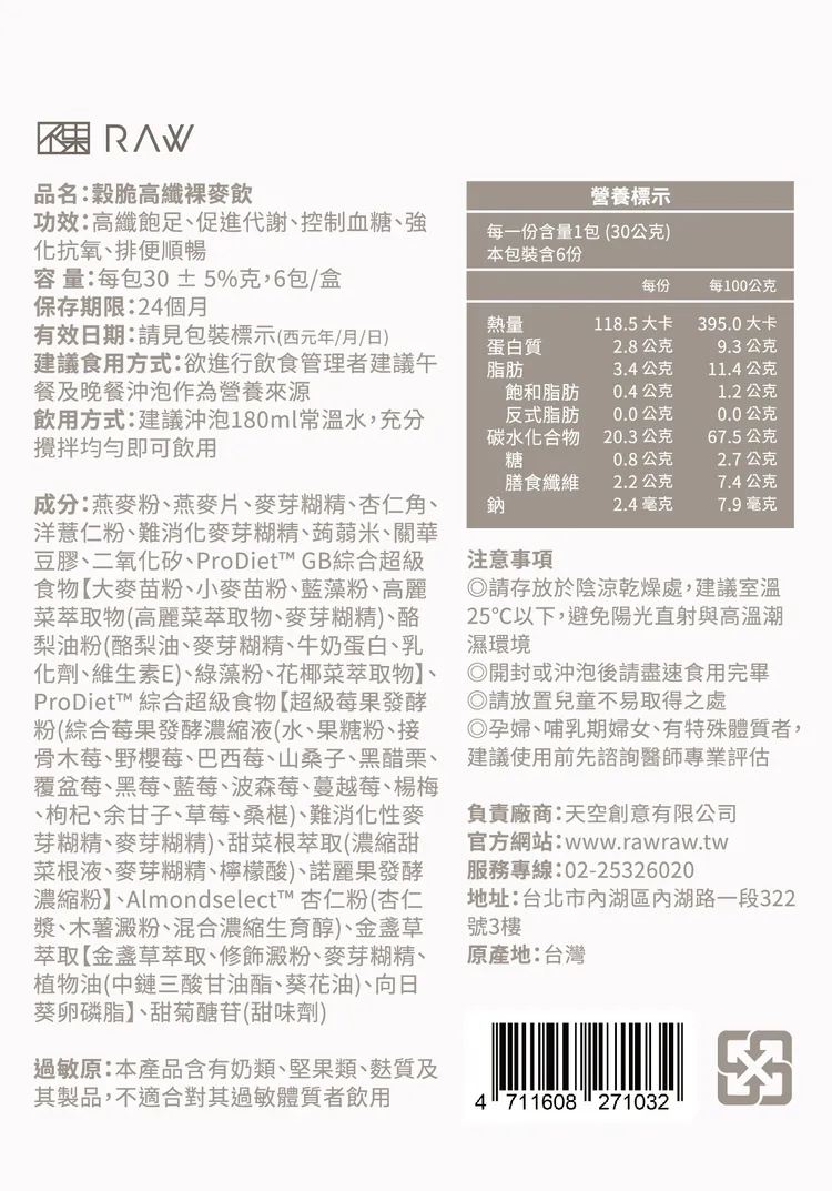 【成分】燕麥粉、燕麥片、麥芽糊精、杏仁角、洋薏仁粉、難消化麥芽糊精、蒟蒻米、關華豆膠、二氧化矽、ProDiet™ GB 綜合超級食物【大麥苗粉、小麥苗粉、藍藻粉、高麗菜萃取物(高麗菜萃取物、麥芽糊精)、酪梨油粉(酪梨油、麥芽糊精、牛奶蛋白、乳化劑、維生素 E)、綠藻粉、花椰菜萃取物】、ProDiet™綜合超級食物【超級莓果發酵粉(綜合莓果發酵濃縮液(水、果糖粉、接骨木莓、野櫻莓、巴西莓、山桑子、黑醋栗、覆盆莓、黑莓、藍莓、波森莓、蔓越莓、楊梅、枸杞、余甘子、草莓、桑椹)、難消化性麥芽糊精、麥芽糊精)、甜菜根萃取(濃縮甜菜根液、麥芽糊精、檸檬酸)、諾麗果發酵濃縮粉】、Almondselect™杏仁粉(杏仁漿、木薯澱粉、混合濃縮生育醇)、金盞草萃取【金盞草萃取、修飾澱粉、麥芽糊精、植物油(中鏈三酸甘油酯、葵花油)、向日葵卵磷脂】、甜菊醣苷(甜味劑)