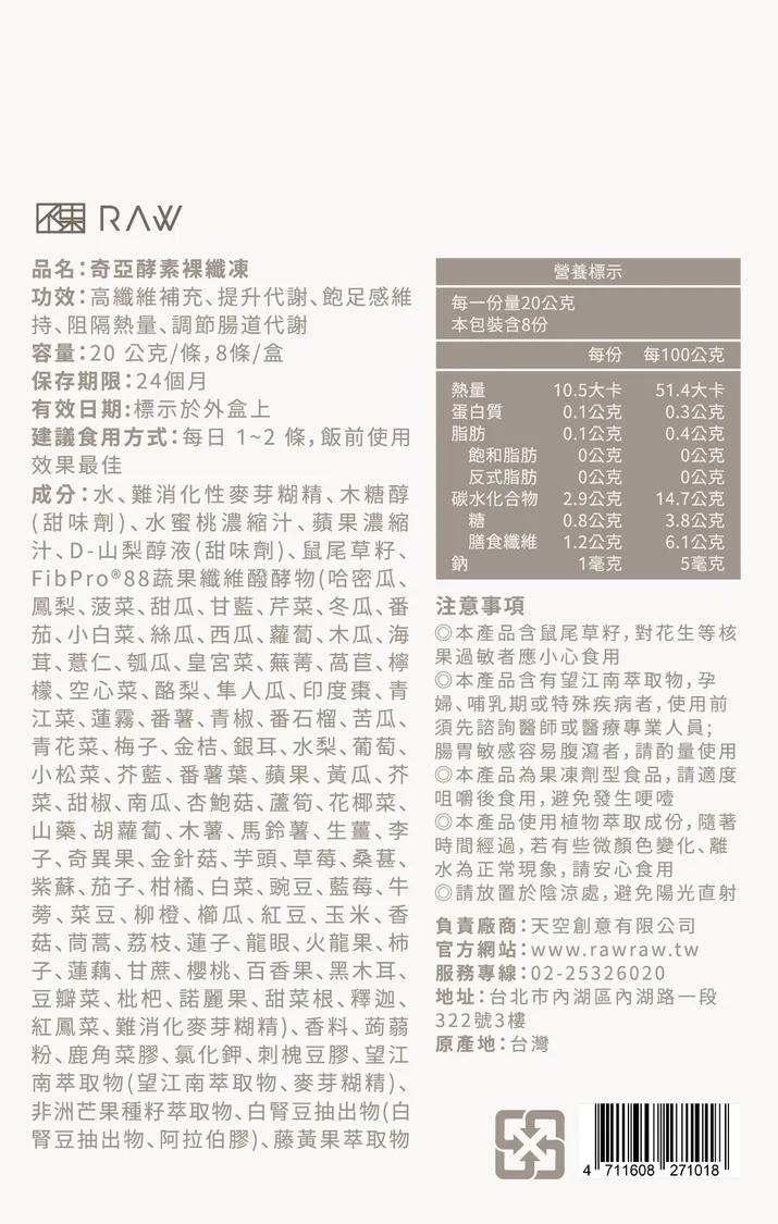 【成分】水、難消化性麥芽糊精、木糖醇(甜味劑)、水蜜桃濃縮汁、蘋果濃縮汁、D-山梨醇液(甜味劑)、鼠尾草籽、FibPro®88 蔬果纖維醱酵物(哈密瓜、鳳梨、菠菜、甜瓜、甘藍、芹菜、冬瓜、番茄 、小白菜、絲瓜、西瓜、蘿蔔、木瓜、海茸、薏仁、瓠瓜、皇宮菜、蕪菁、萵苣、檸檬、空心菜、酪梨、隼人瓜、印度棗、青江菜、蓮霧、番薯、青椒、番石榴、苦瓜、青花菜、梅子、金桔、銀耳、水梨、葡萄、小松菜、芥藍、番薯葉、蘋果、黃瓜、芥菜、甜椒、南瓜、杏鮑菇、蘆筍、花椰菜、山藥、胡蘿蔔、木薯、馬鈴薯、生薑、李子、奇異果、金針菇、芋頭、草莓、桑葚、紫蘇、茄子、柑橘、白菜、豌豆、藍莓、牛蒡、菜豆、柳橙、櫛瓜、紅豆、玉米、香菇、茼蒿、荔枝、蓮子、龍眼、火龍果、柿子、蓮藕、甘蔗、櫻桃、百香果、黑木耳、豆瓣菜、枇杷、諾麗果、甜菜根、釋迦、紅鳳菜、難消化麥芽糊精)、香料、蒟蒻粉、鹿角菜膠、氯化鉀、刺槐豆膠、望江南萃取物(望江南萃取物、麥芽糊精)、非洲芒果種籽萃取物、白腎豆抽出物(白腎豆抽出物、阿拉伯膠)、藤黃果萃取物。